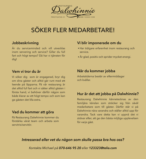 Som en kvarterskrog ser vi ofta oss själva som en liten familj där vi värnar om varandra och våra gäster! Vill du vara en del av vår familj, tveka då inte att söka jobb hos oss!