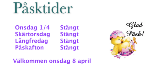 Avvikande öppettider: Stängt påsk 1/4 till 4/4, Stängt Kristi himmelfärd 14/5 Stängt för semester 17/6 till 25/6.